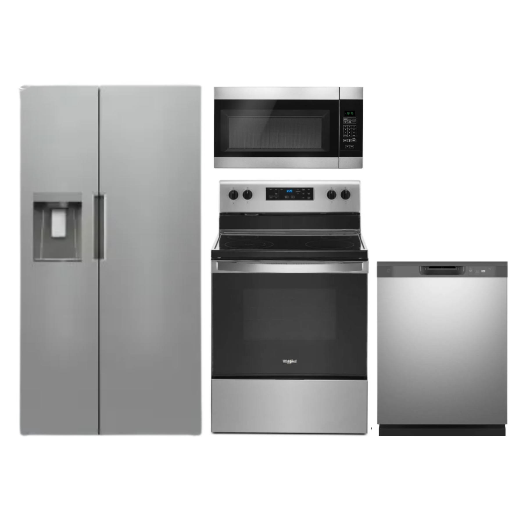 4 Piece Kitchen Package-Stainless Steel with a side-by-side refrigerator, free-standing electric range, built-in dishwasher, and over the range microwaveRead More