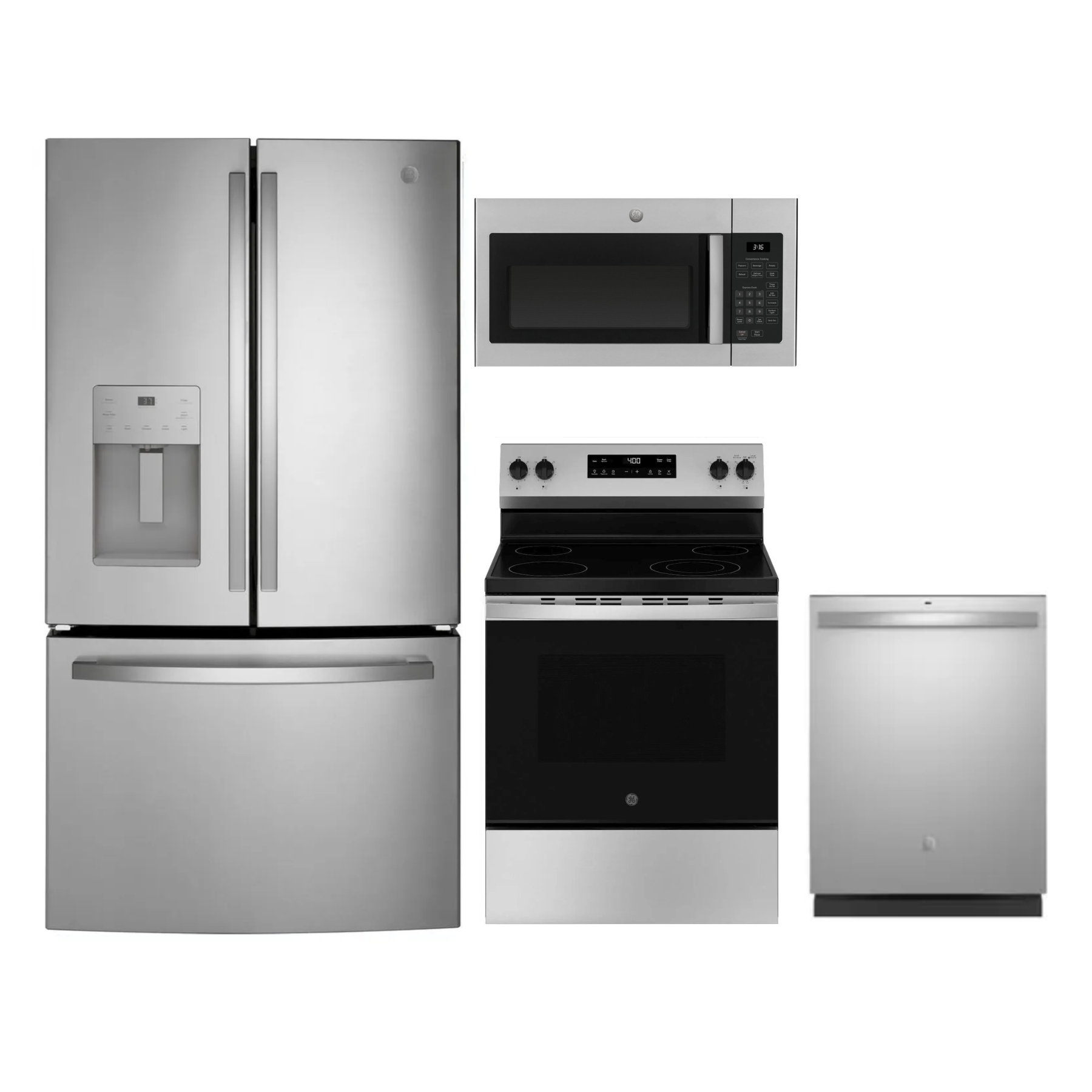 GE® 4 Piece Kitchen Package-Stainless Steel with French Door Refrigerator, Freestanding Electric Convection Range, Built-In Dishwasher, and Over The Range Sensor Microwave.Read More