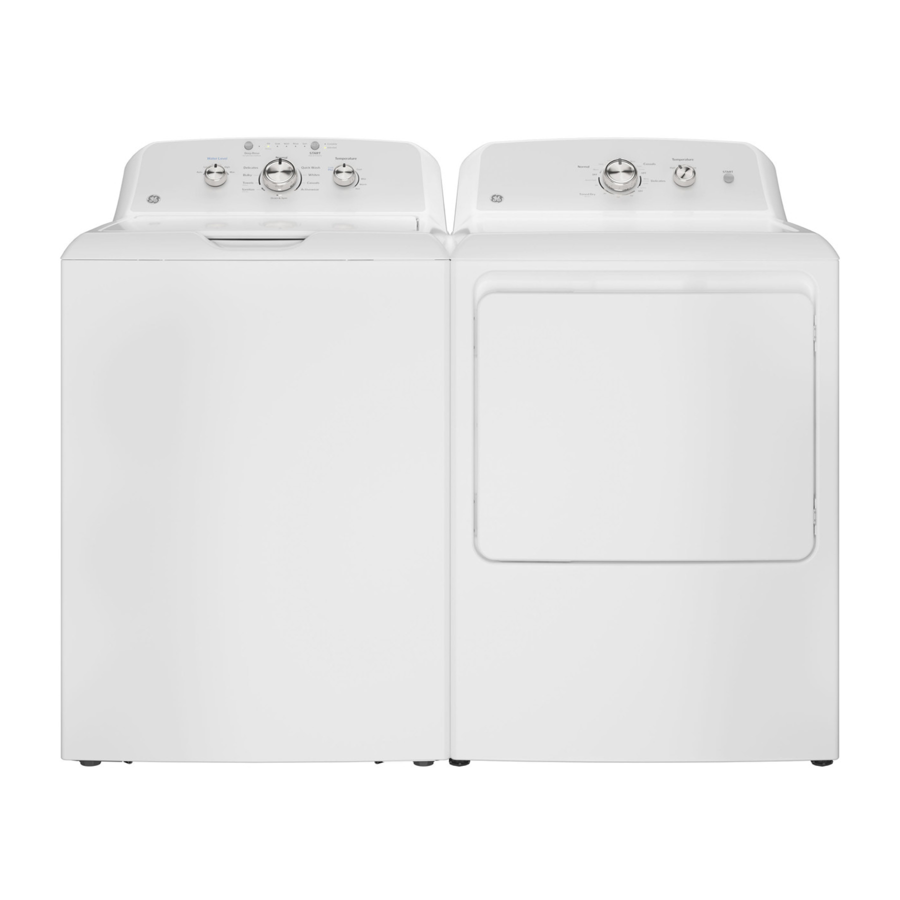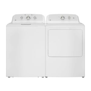 GE® White Laundry Pair with a 4.3 cu. ft. capacity top load washer and a 6.2 cu. ft. capacity front load electric dryer.Read More