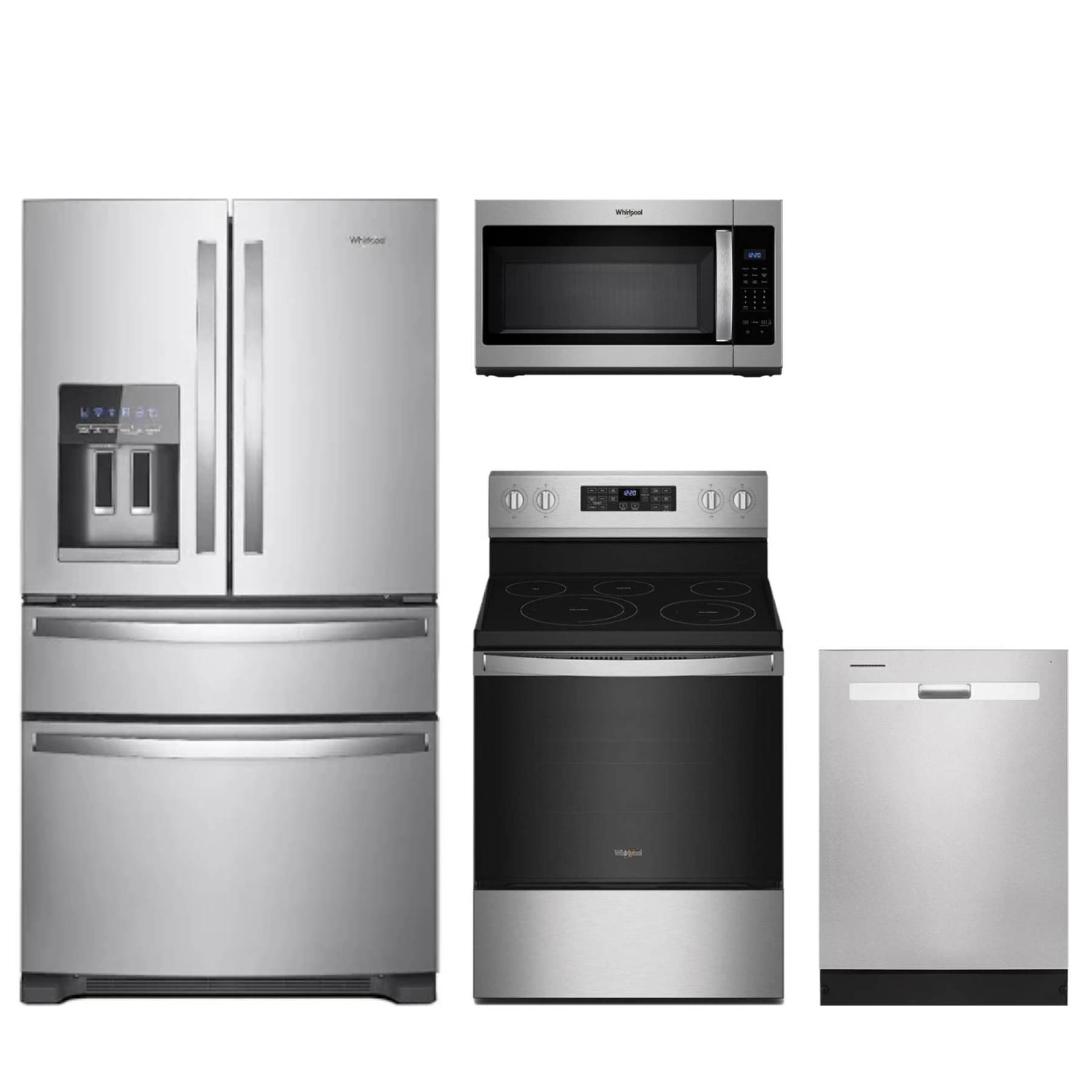 Whirlpool® 4 Piece Fingerprint Resistant Stainless Steel Kitchen Package with french door refrigerator, free standing electric range, over the range microwave, and built in dishwasherRead More