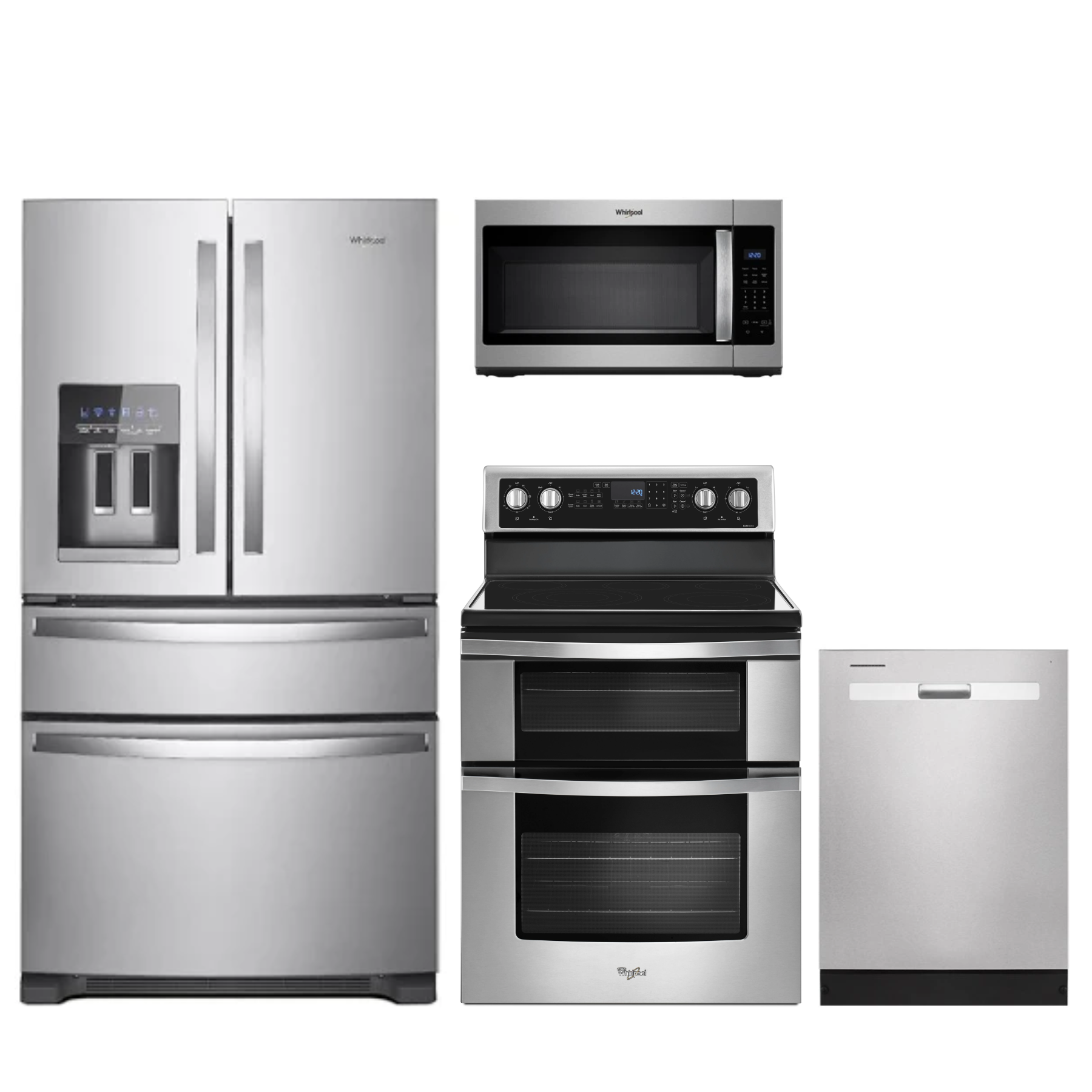 Whirlpool® 4 Piece Fingerprint Resistant Stainless Steel Kitchen Package with french door refrigerator, free standing electric range, over the range microwave, and built in dishwasherRead More